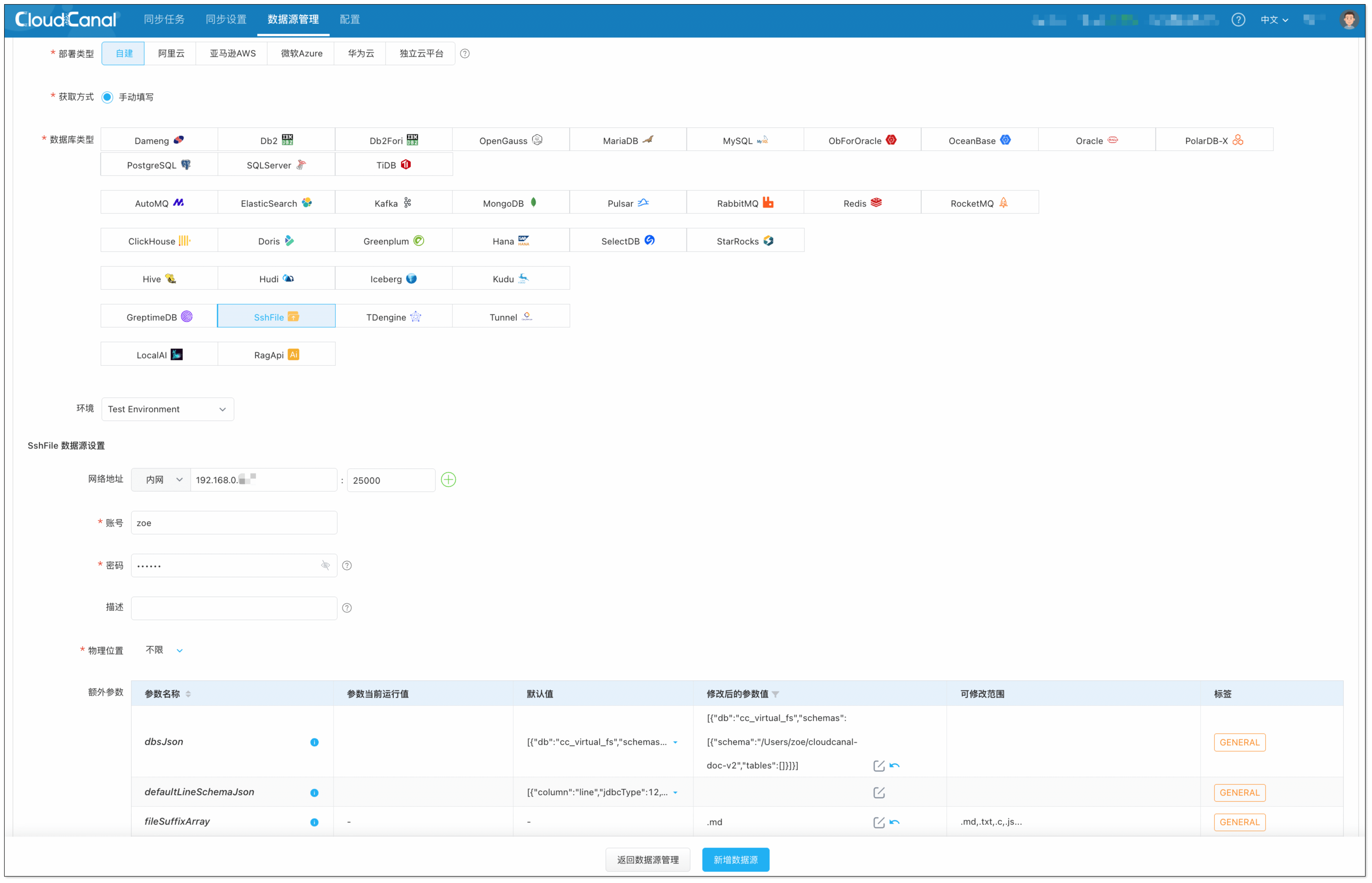 选择 自建 > SshFile 数据源,可设定额外参数。