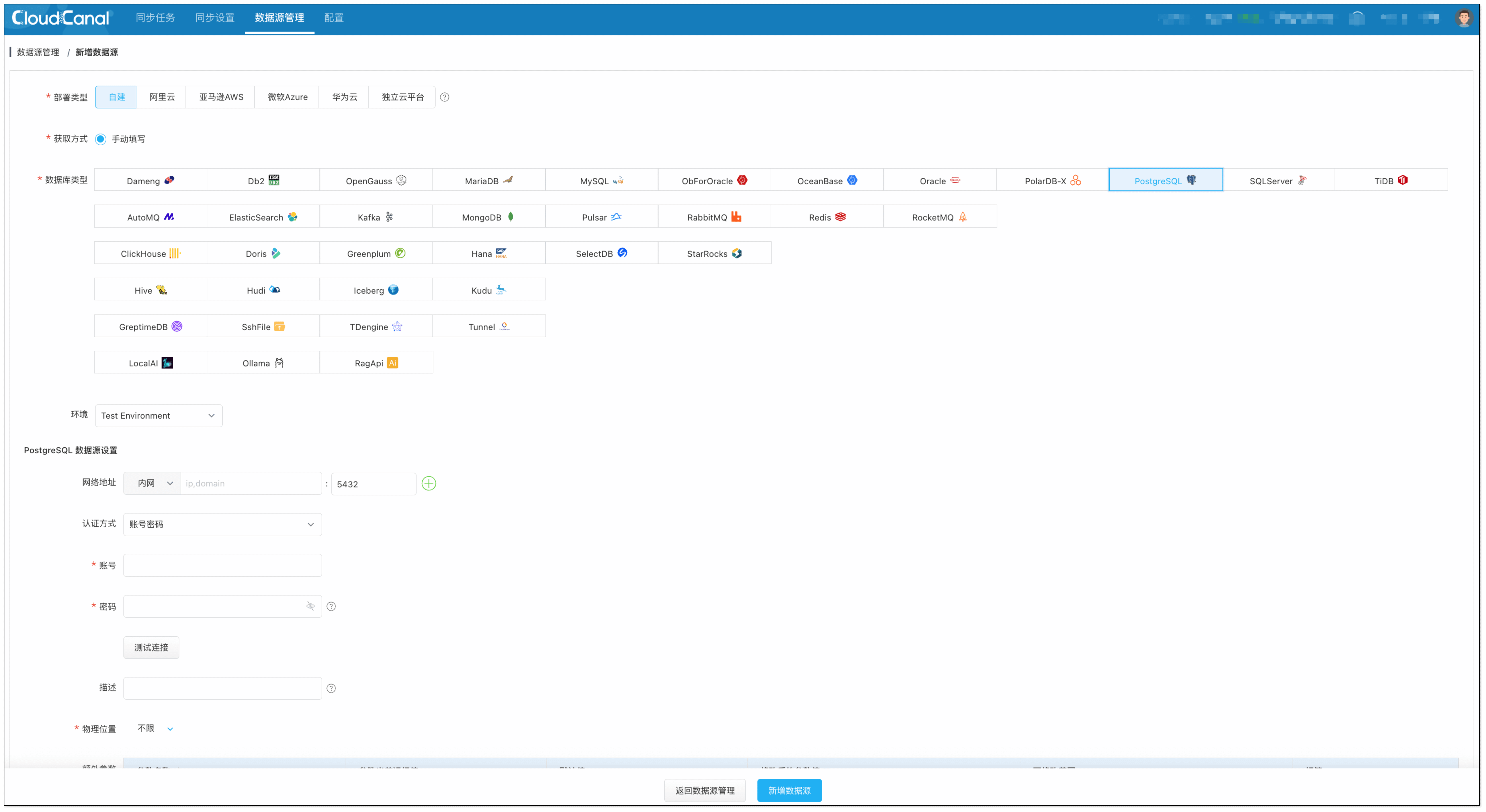 - 选择以下数据源,并点击 测试连接 确认网络与权限正常。