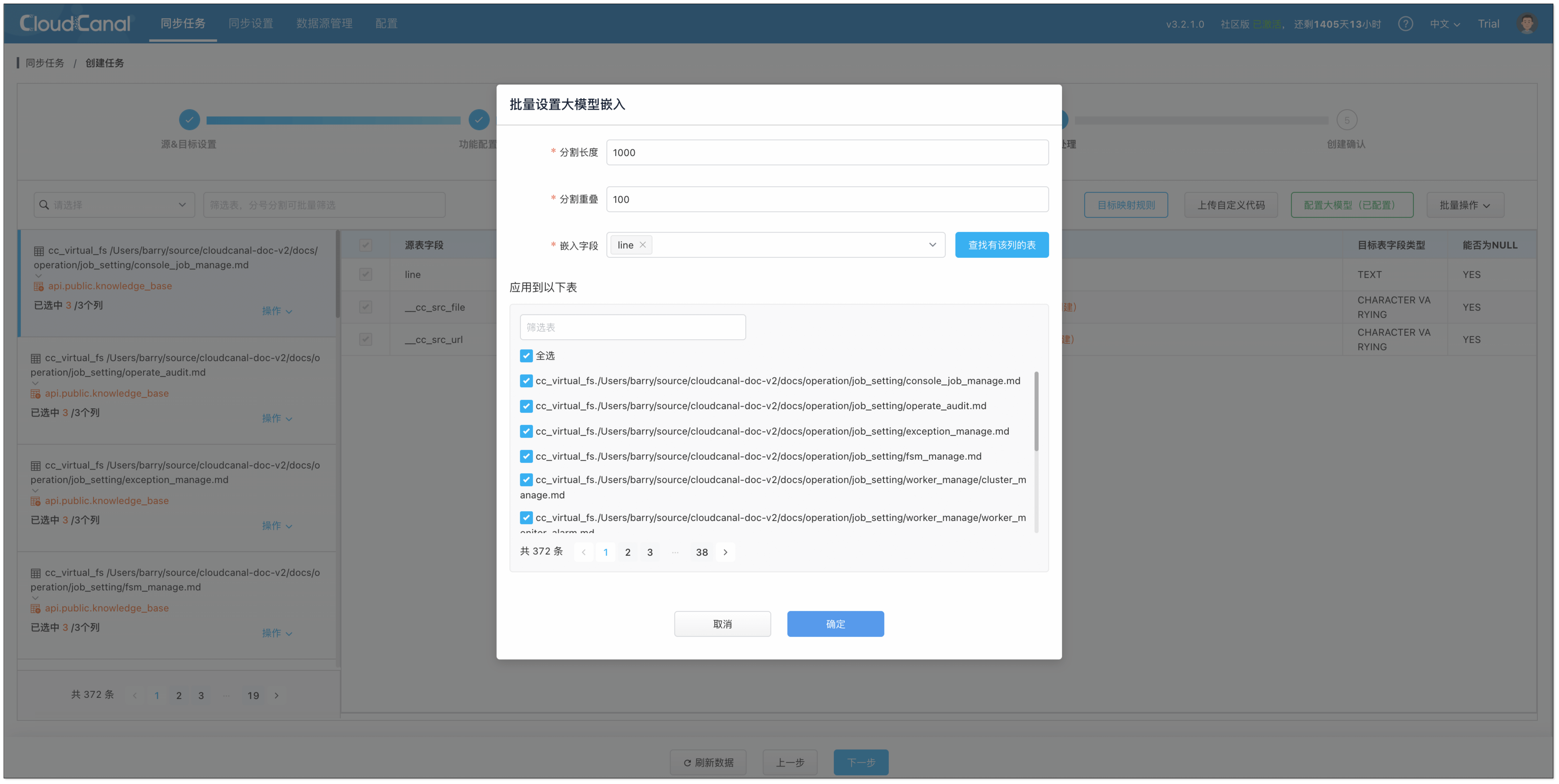 - 点击 批量修改目标名称 > 统一表名 > 填写表名(如 knowledge_base),并确认,方便将不同文件向量化并写入同一个表。