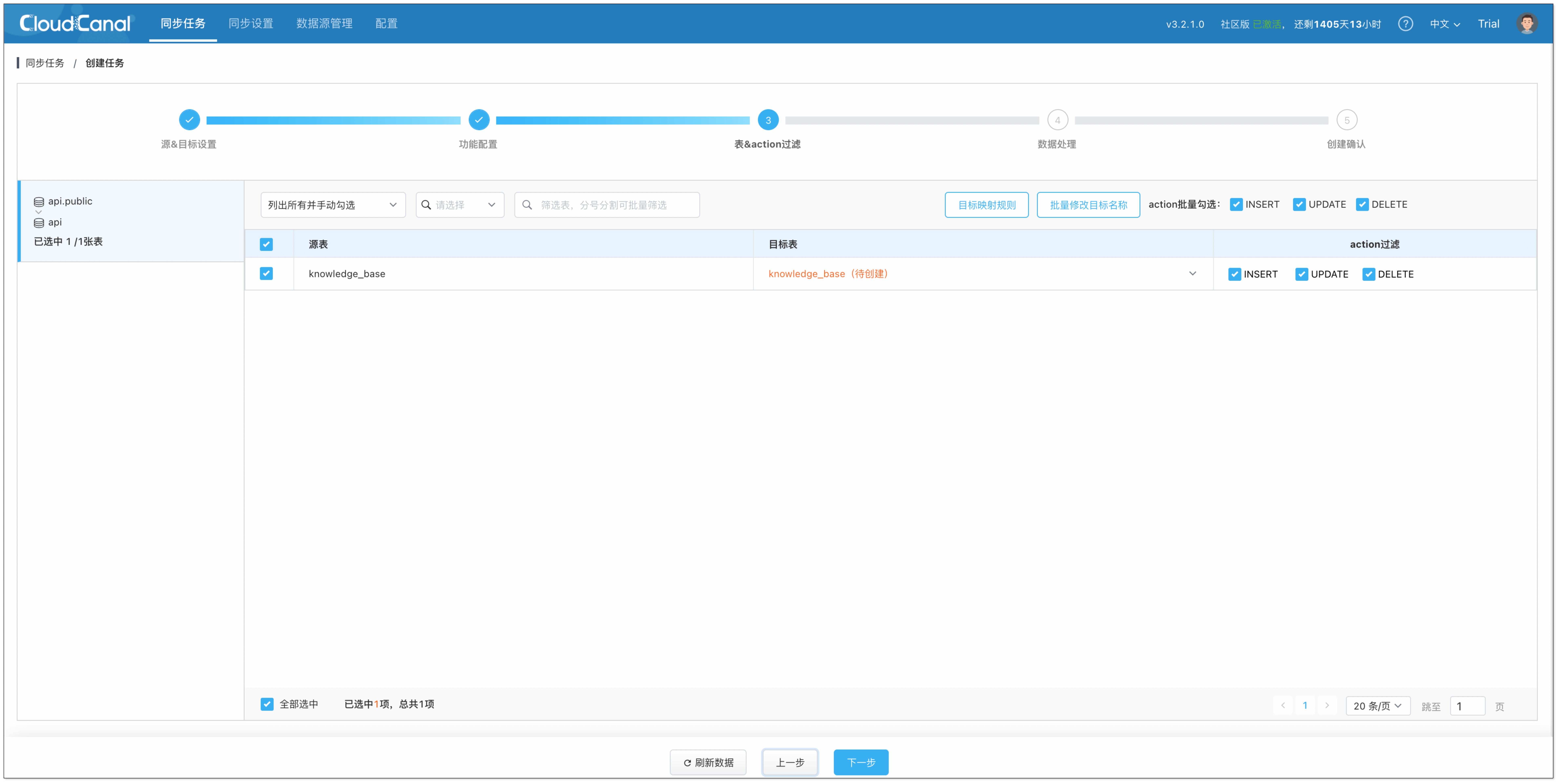 - 在 表&action过滤 页面,选择要使用的向量表(可多选)。