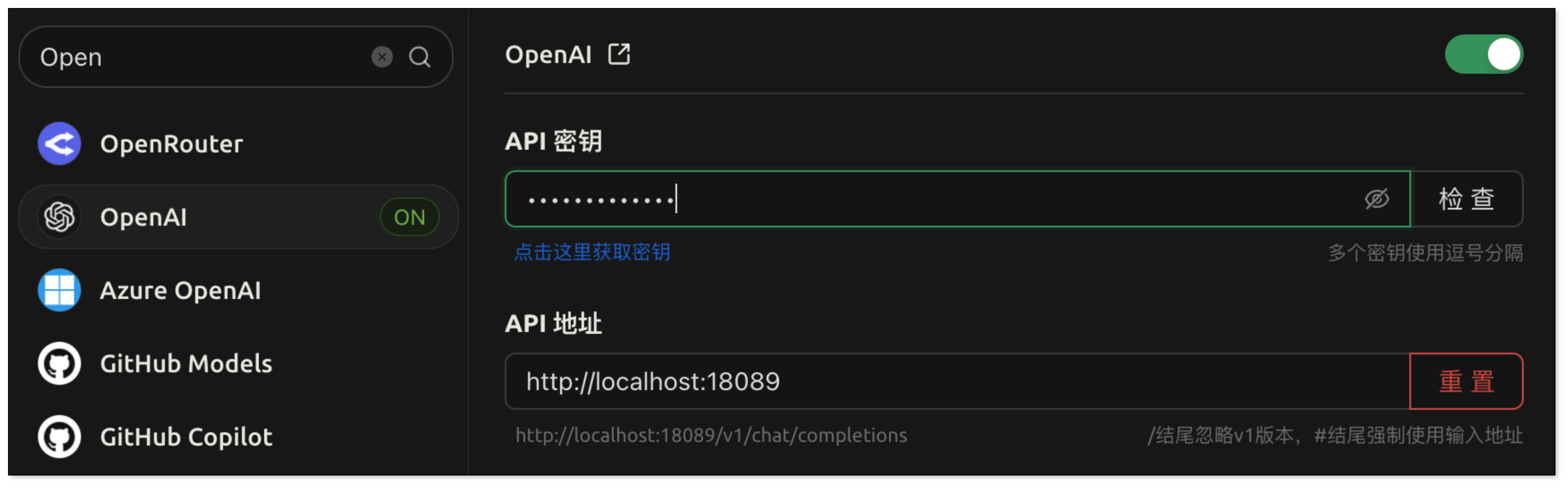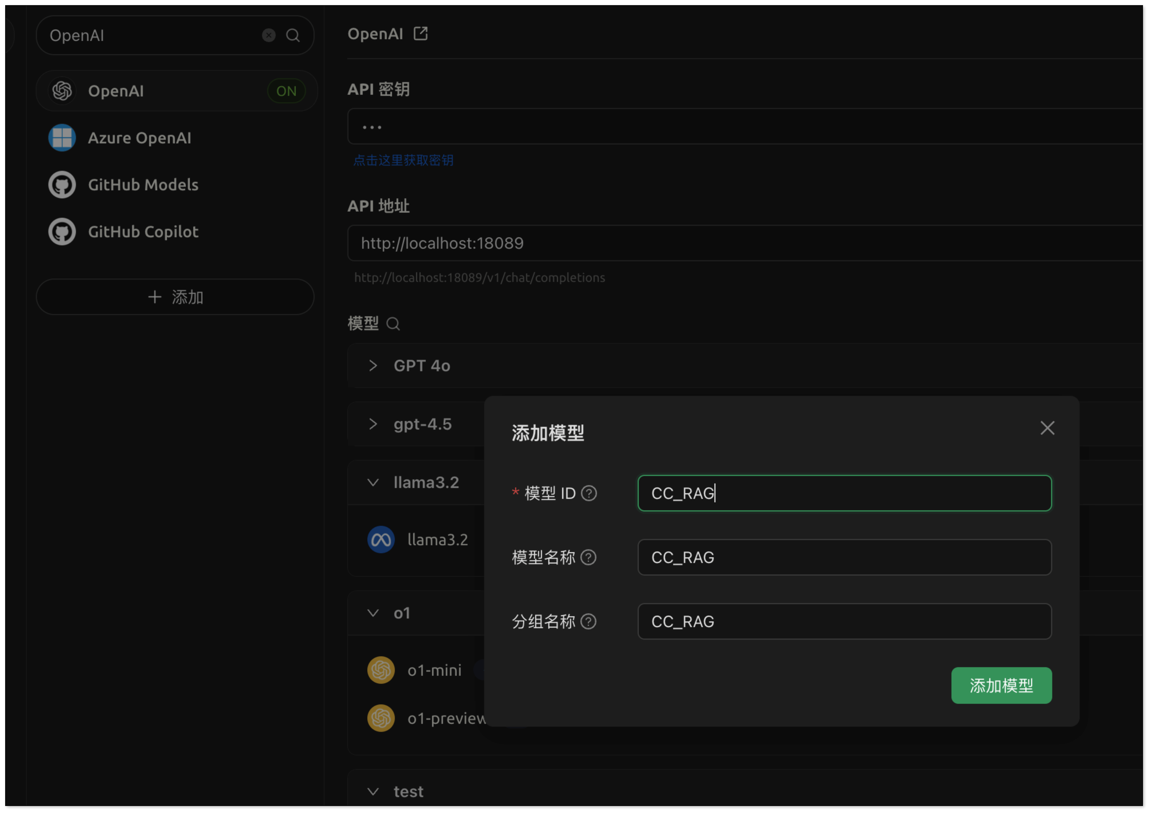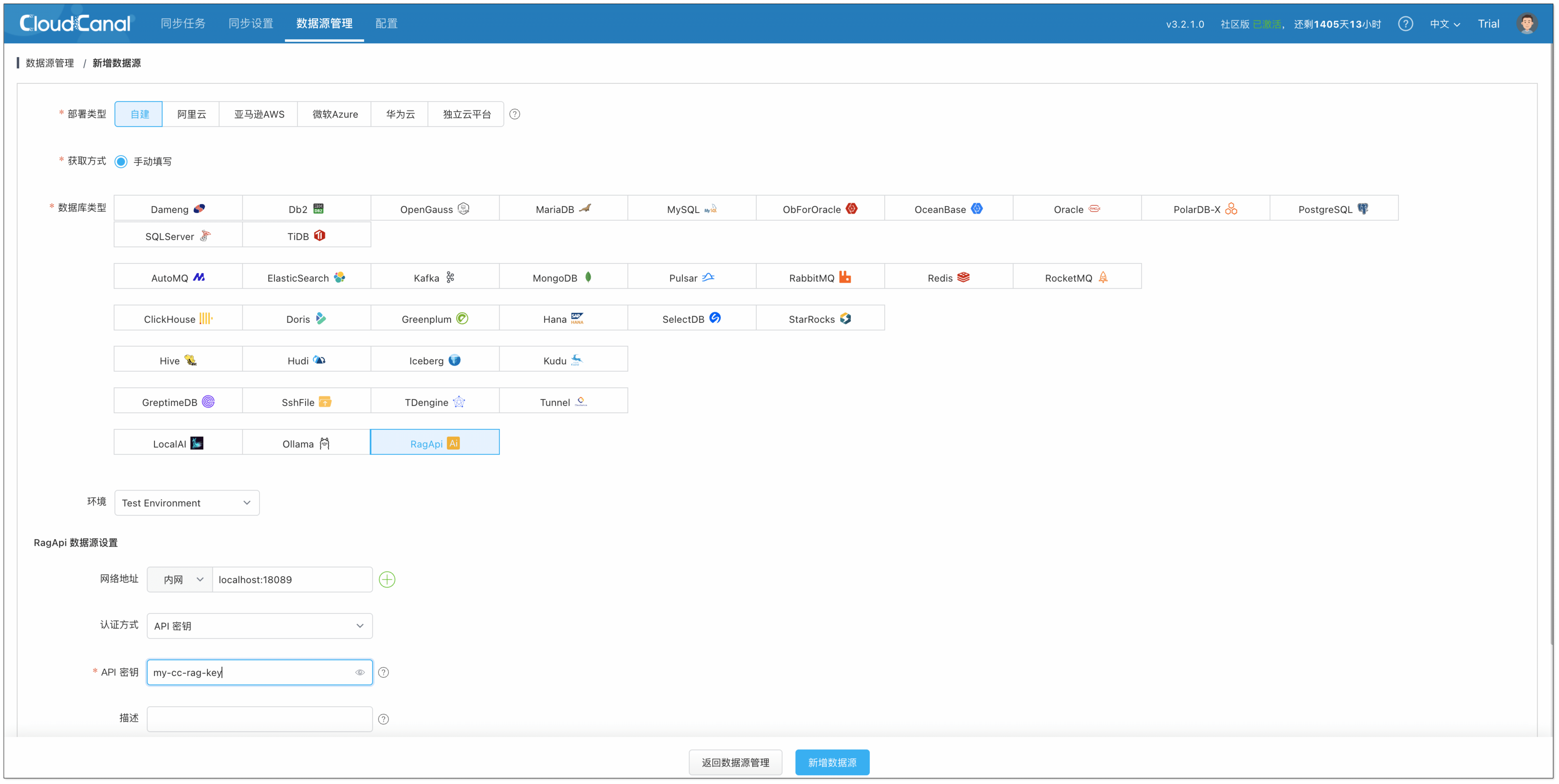OpenAI,并配置如下参数:- API 密钥:填写在 CloudCanal 中 RagApi 设置的密钥:my-cc-rag-key