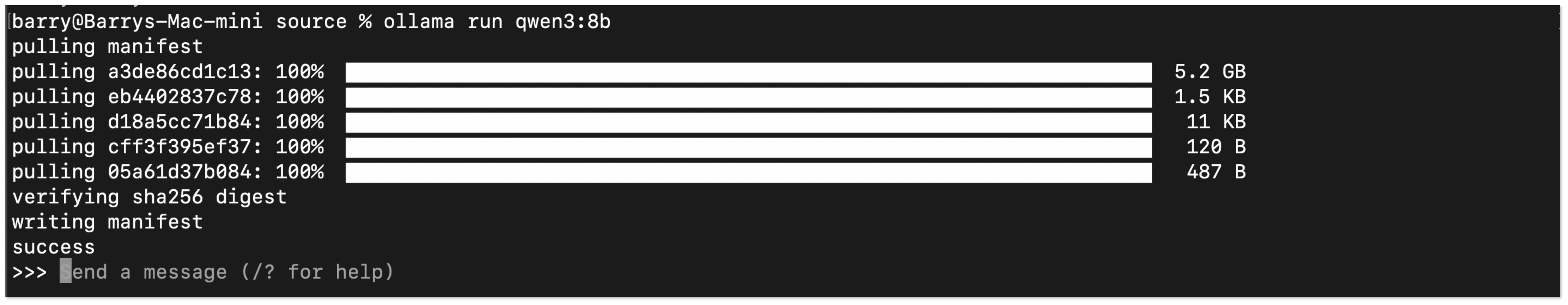 安装完成后,打开终端,执行以下命令来拉取并运行一个适合嵌入和推理的模型,例如 qwen3:8b (也可以根据硬件情况选择其他模型,如 qwen3:14b 等。请注意,部分大型模型对硬件资源要求较高):