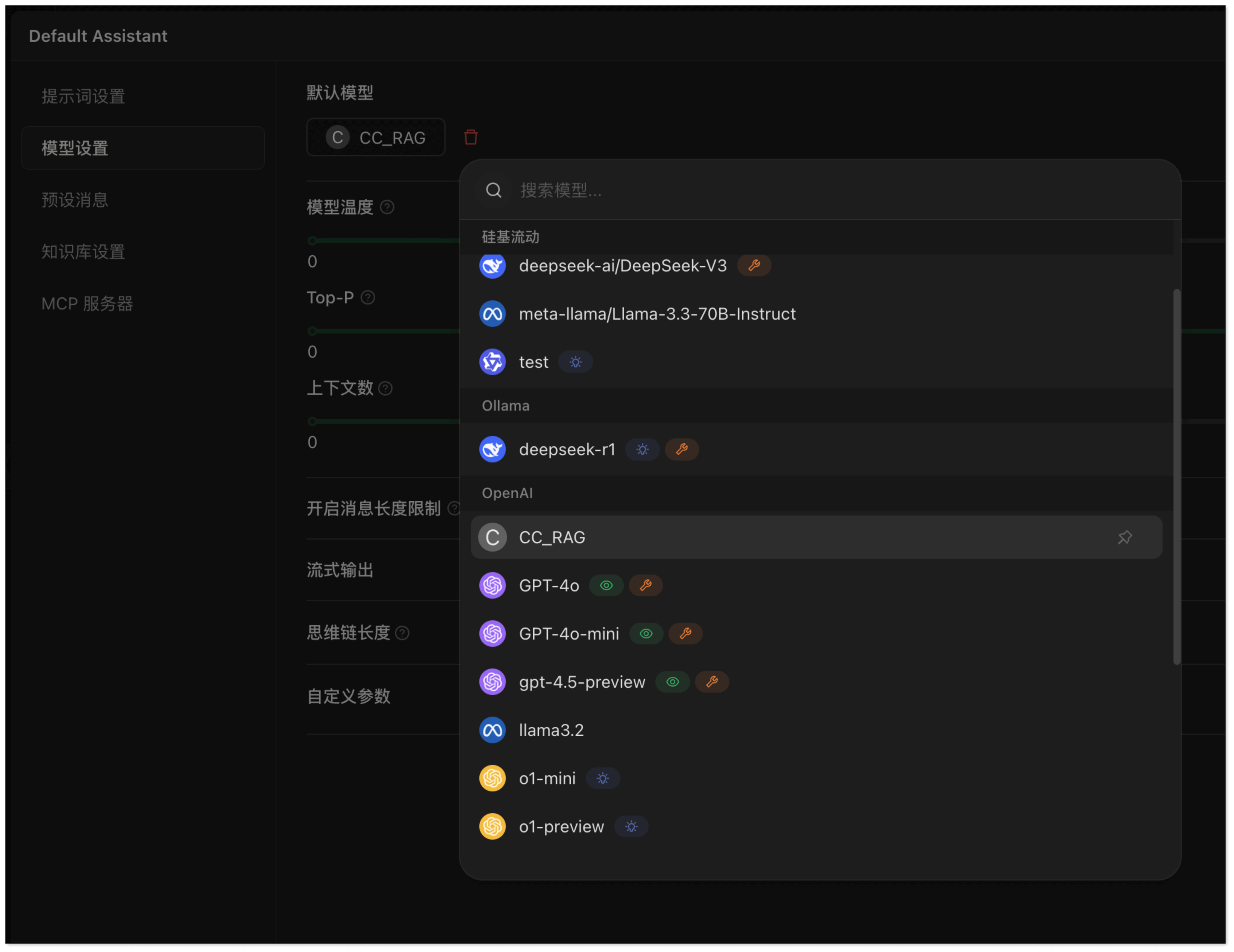 RagApi 支持通过可视化工具 CherryStudio 进行交互测试。CherryStudio 兼容 OpenAI 接口标准,适合用于接口联调、上下文调试和模型效果验证。