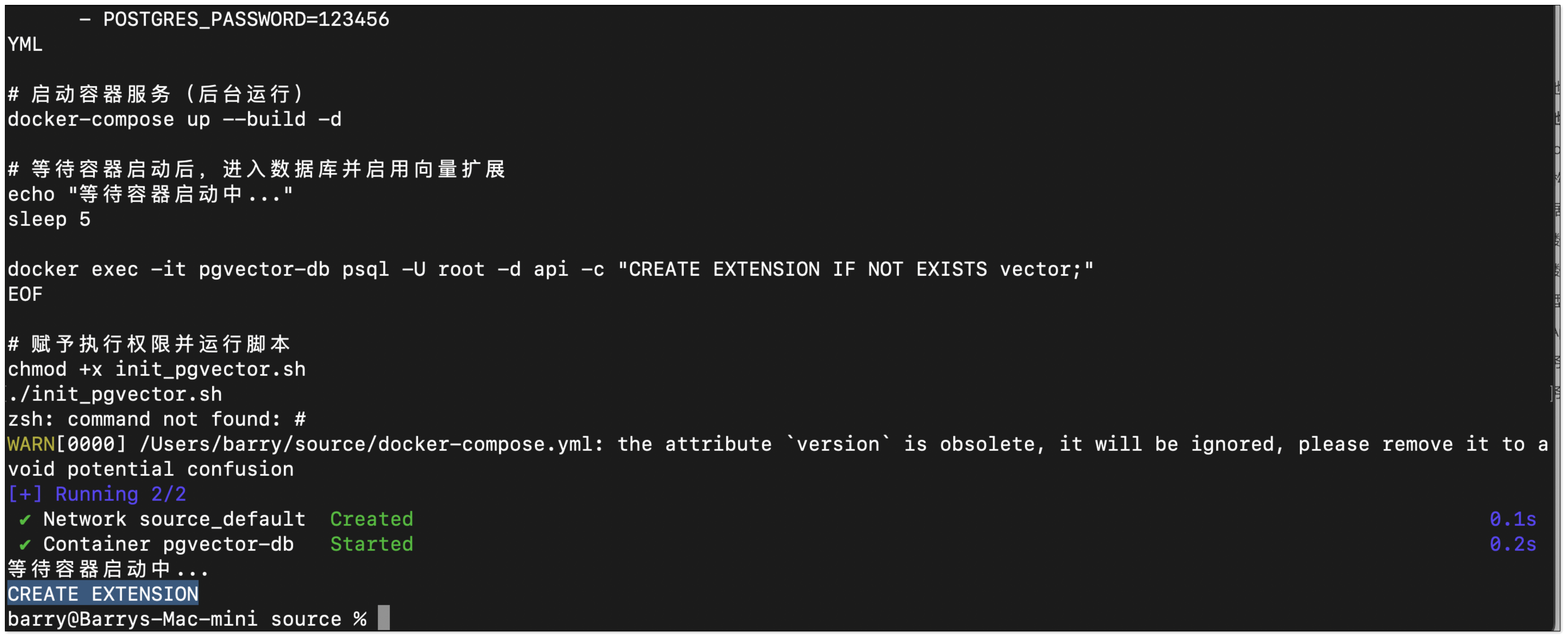 # 等待容 器启动后,进入数据库并启用向量扩展