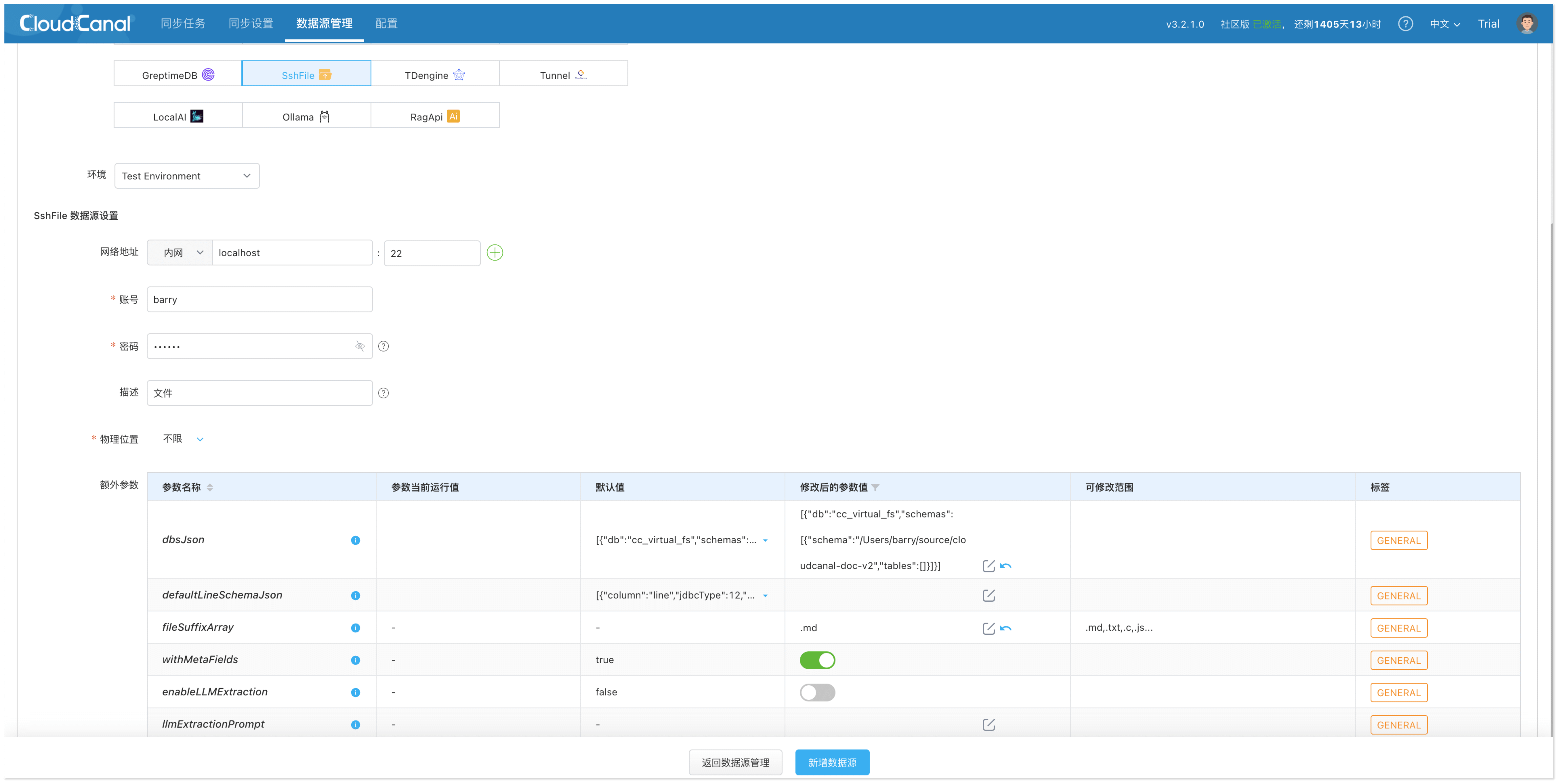 - schema:表示你希望读取的本地或远程目录路径,CloudCanal 会以该路径作为文档扫描入口。例如:/Users/barry/source/cloudcanal-doc-v2。该字段必须填写为绝对路径。