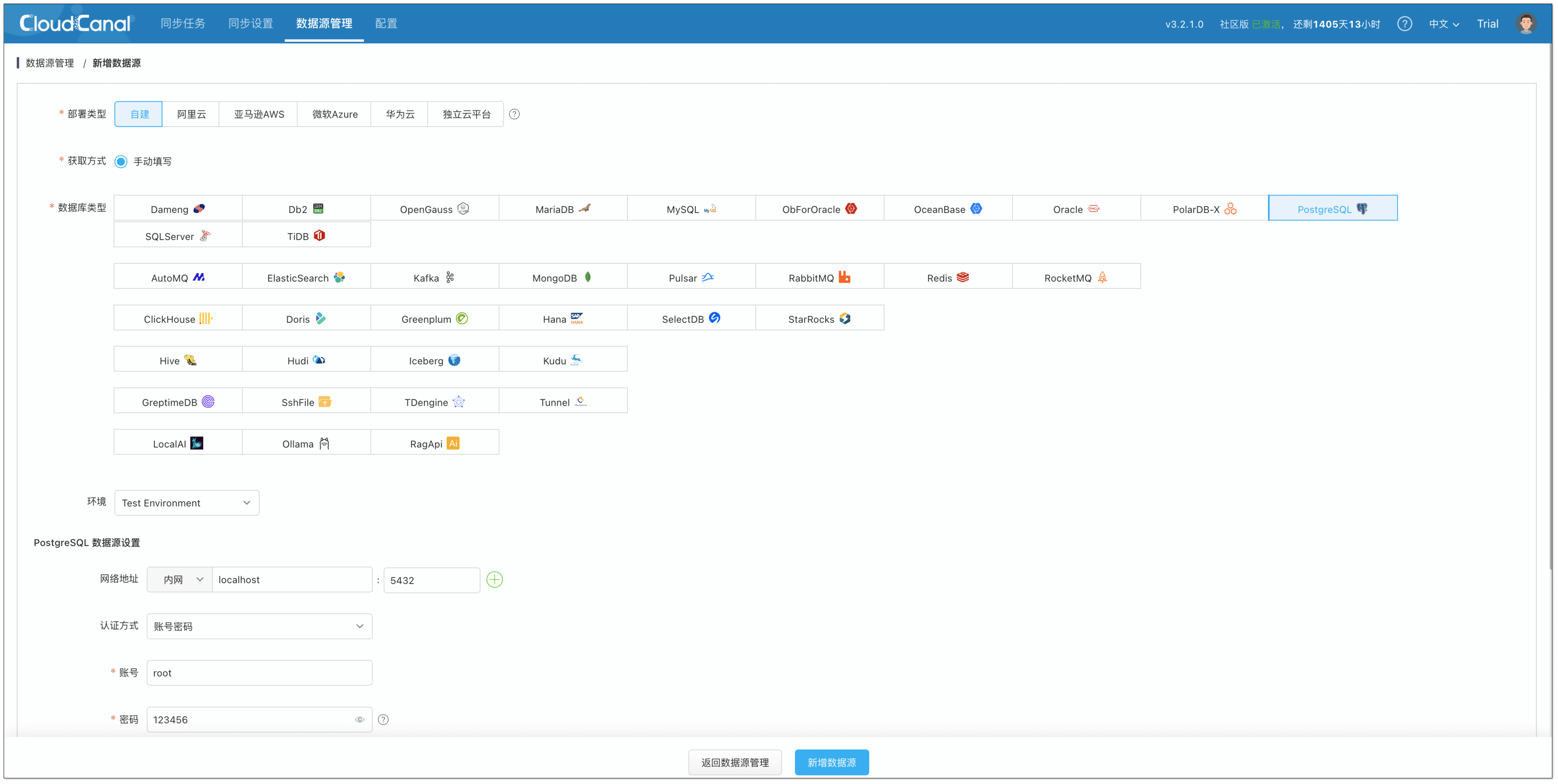 - 选择以下数据源,并点击 测试连接 确认网络与权限正常。