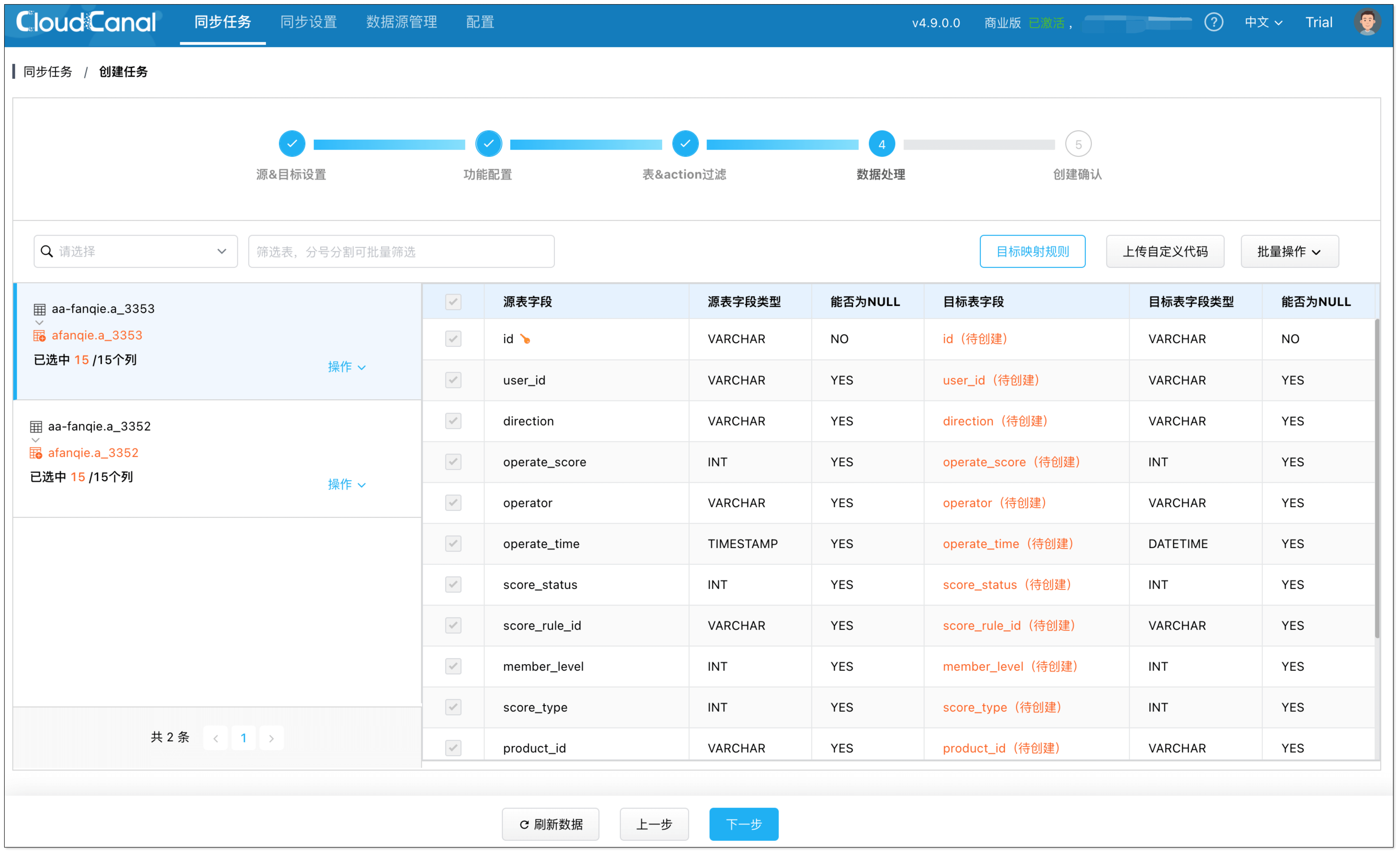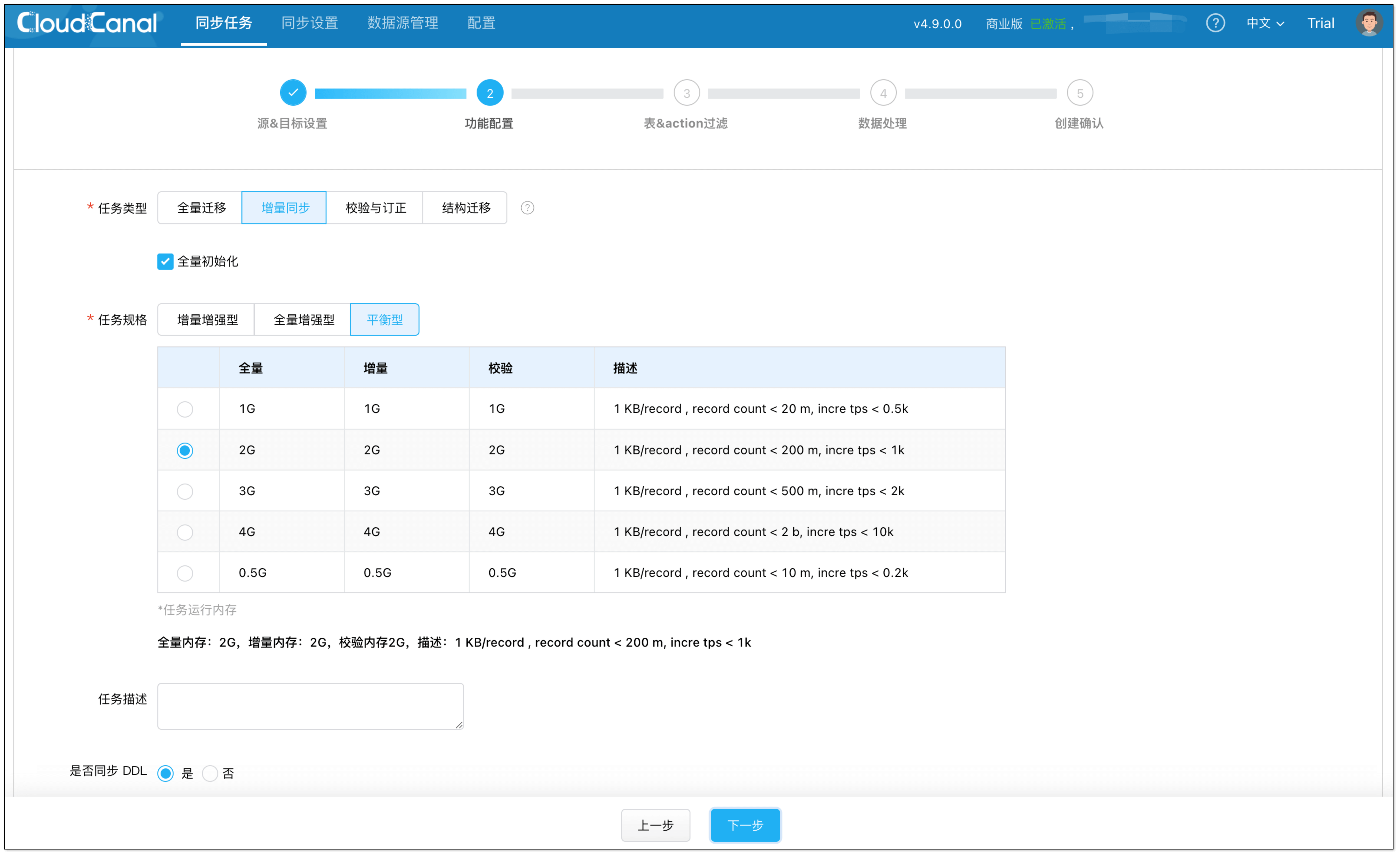 - 在 功能配置 页面,选择 增量同步,并勾选 全量初始化。
