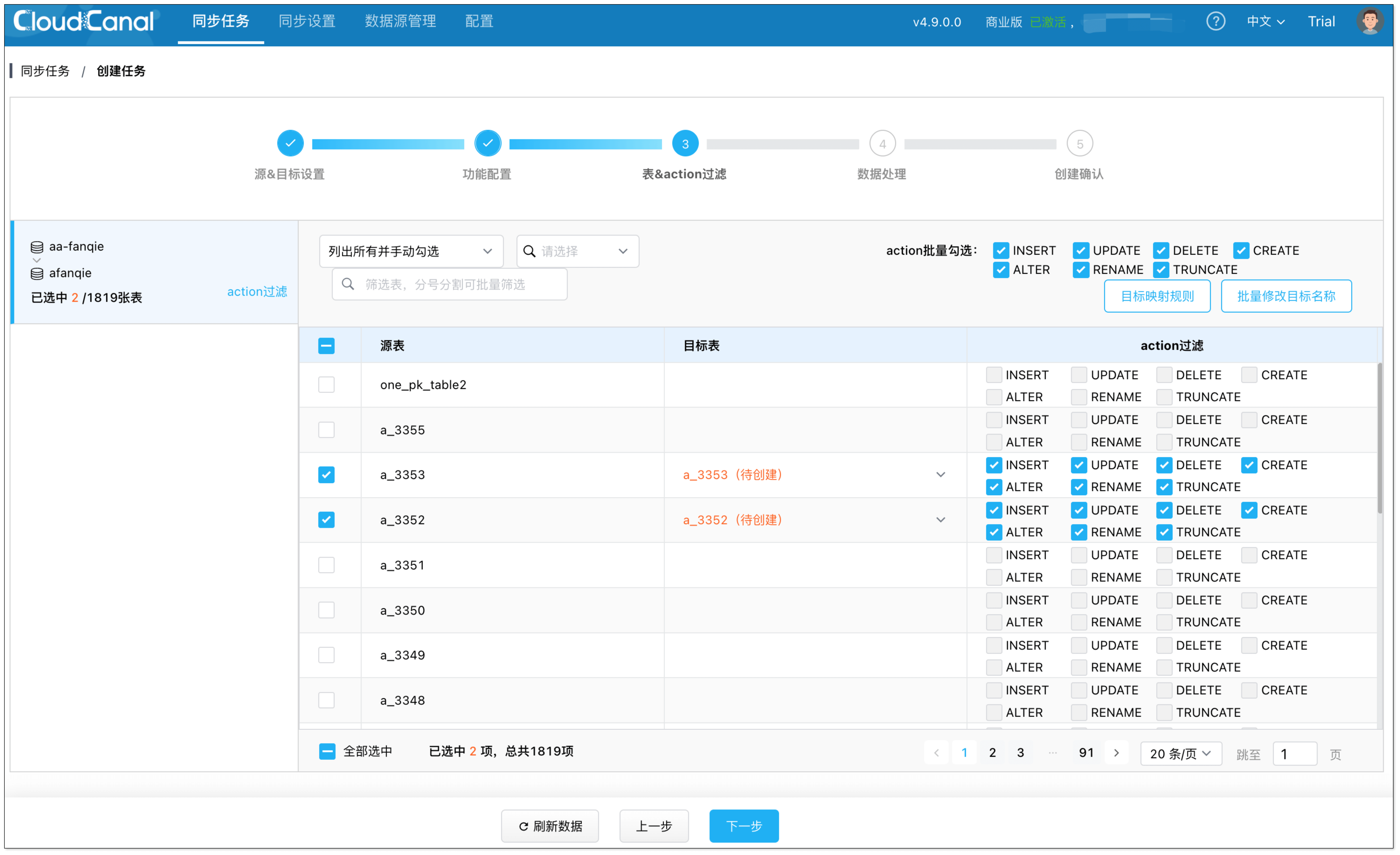 - 在 表和操作过滤 页面,选择需要迁移同步的表,可同时选择多张。