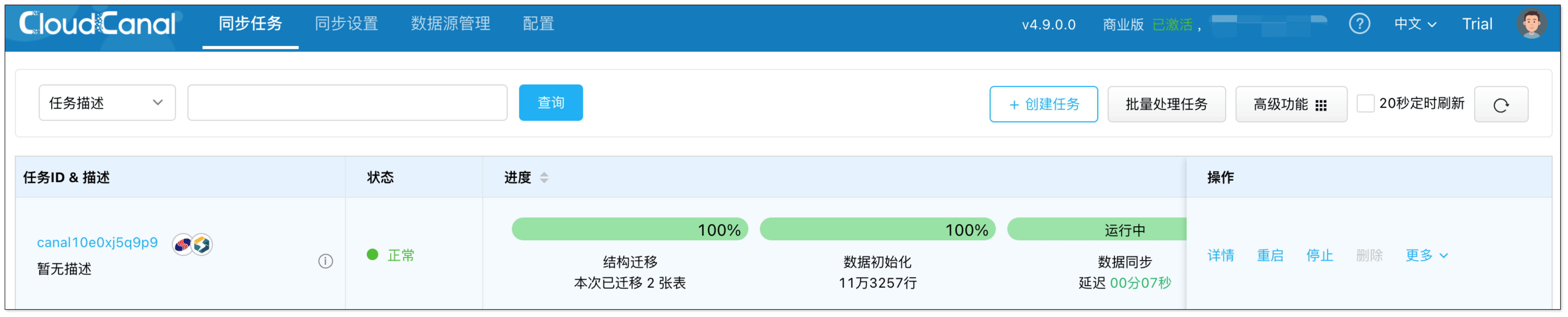 - 全量初始化:CloudCanal 自动完成结构迁移和历史数据一次性迁移。