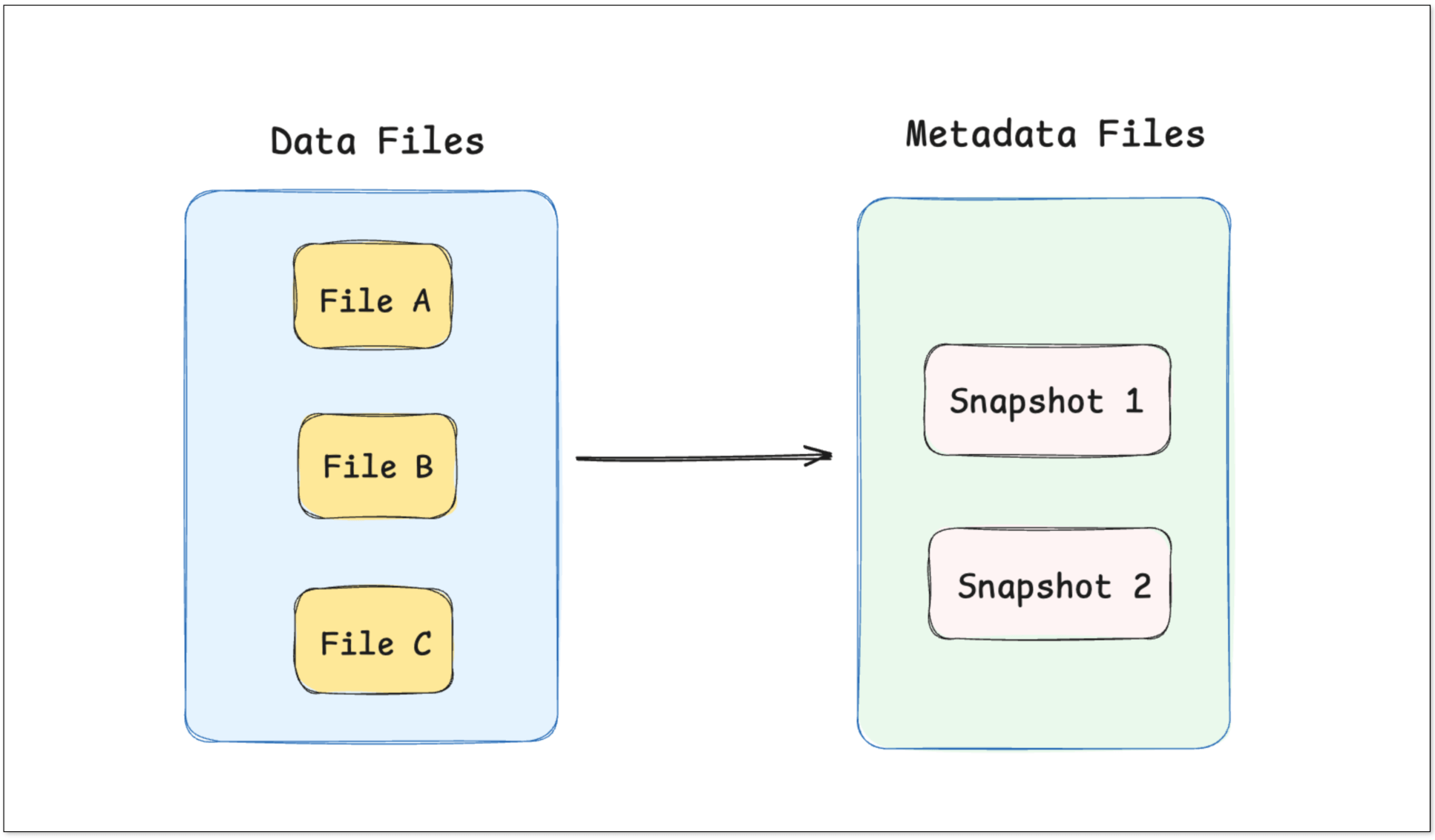 - 引擎创建一个新元数据文件 snapshot_2.json,这个文件会记录当前最新状态 (snapshot_2) 由 file_A 和 file_B 两个文件组成。