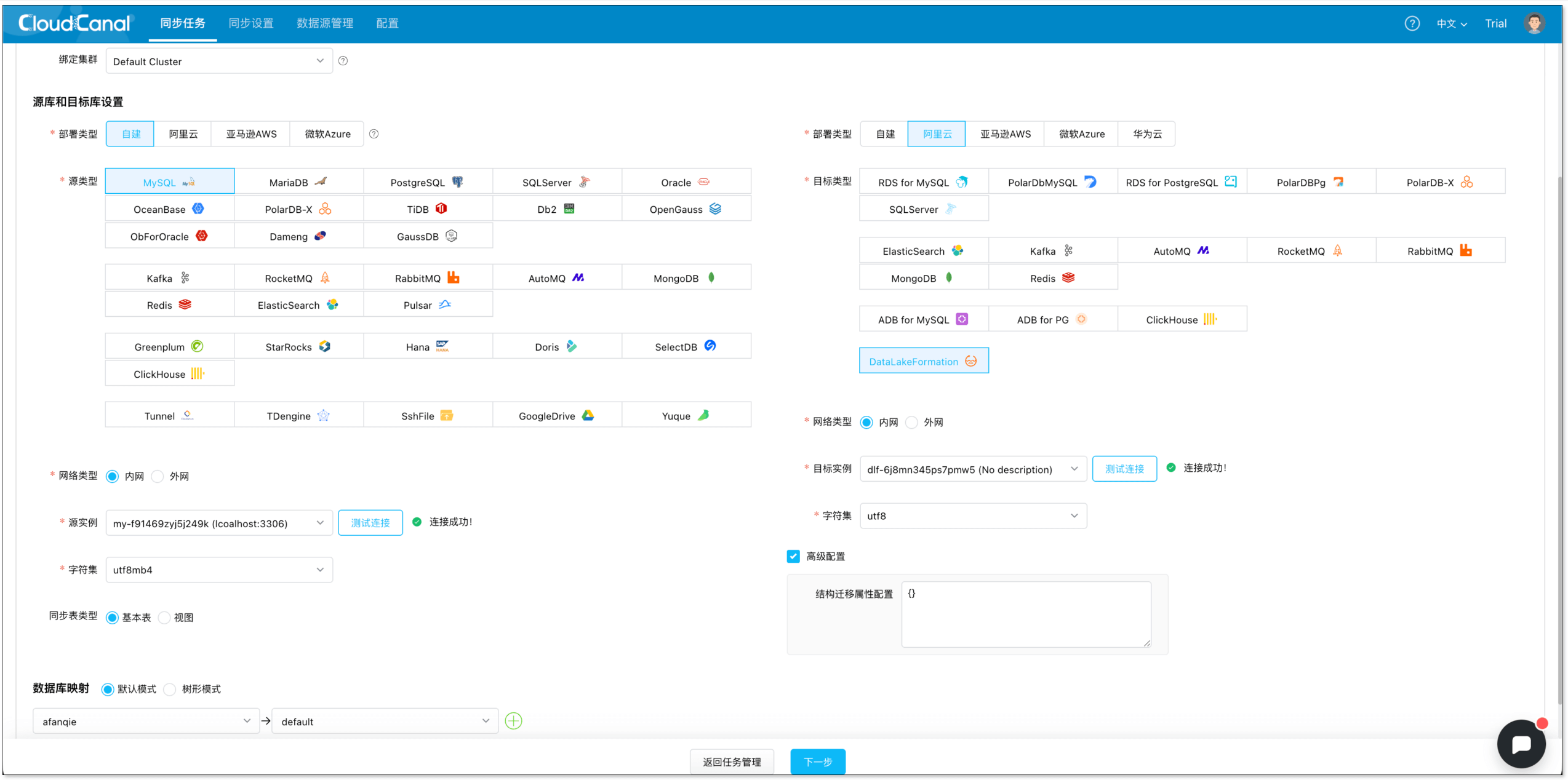 - 选择源和目标实例,并分别点击 测试连接。