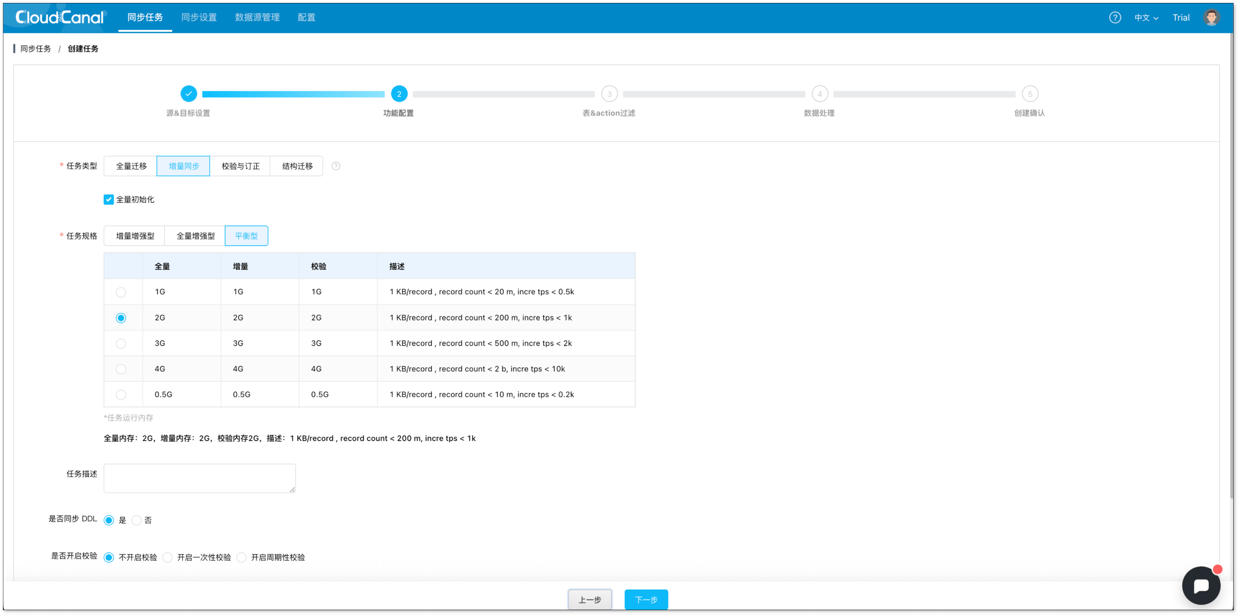 - 在 功能配置 页面,选择 增量同步,并勾选 全 量初始化。