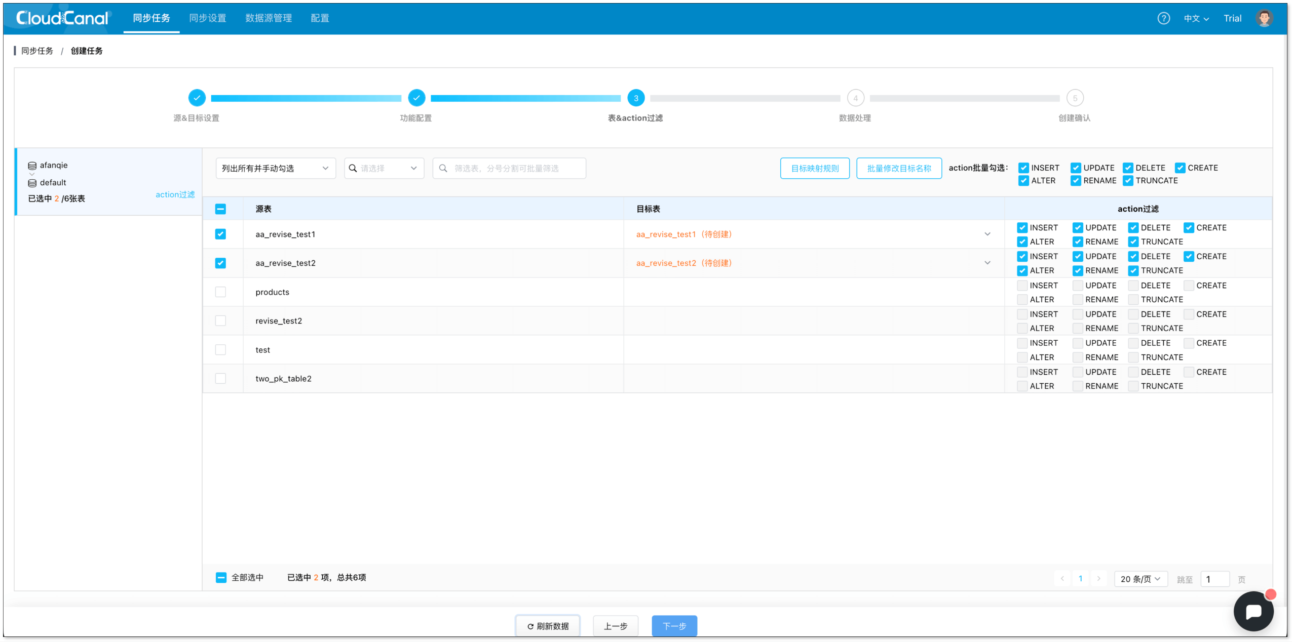 - 在 表和操作过滤 页面,选择需要迁移同步的表,可同时选择多张。