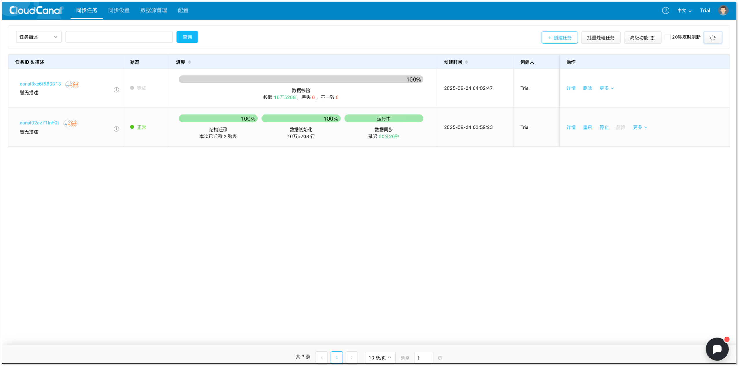 任务启动后,CloudCanal 将自动完成全量数据的初始化,并实时捕获增量变更写入 阿里云 DLF。