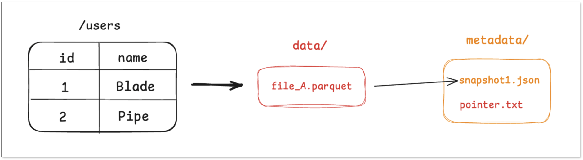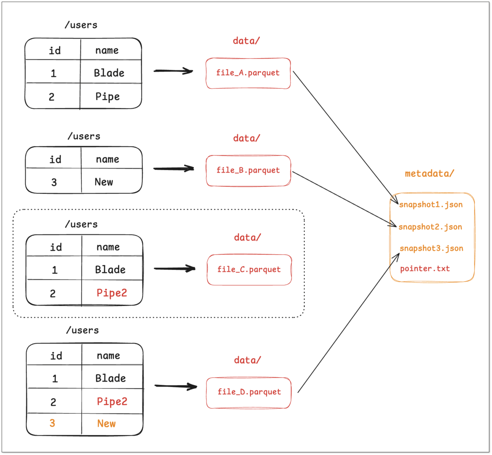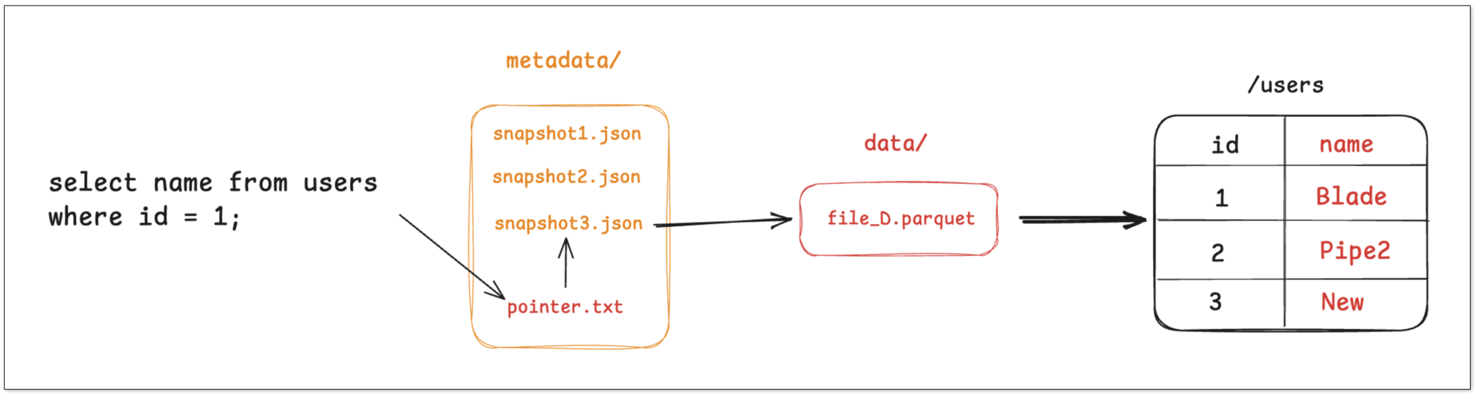 任何查询 users 表的查询请求,都会先找到 pointer.txt,读取 snapshot_1,然后直接去访问 file_A。