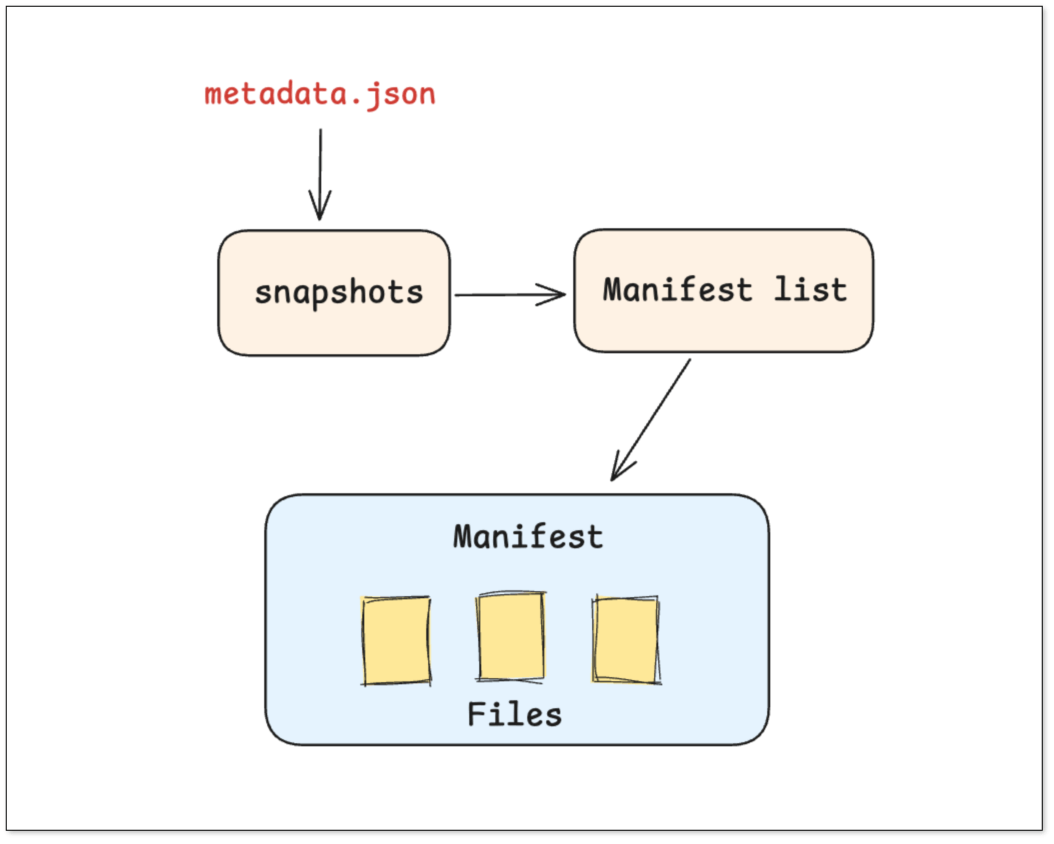 - 元数据文件 (Metadata):一个总览全局的元数据文件,记录了表的 Schema、分区规则,以及所有 (Snapshots) 历史快照的索引。