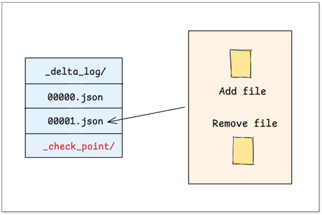 - 事务日志 (Transaction Log):每一次对表的写入、更新或删除,都会生成一个新的 JSON 文件,清晰地记录了本次操作 增加 了哪些文件,删除 了哪些文件。
