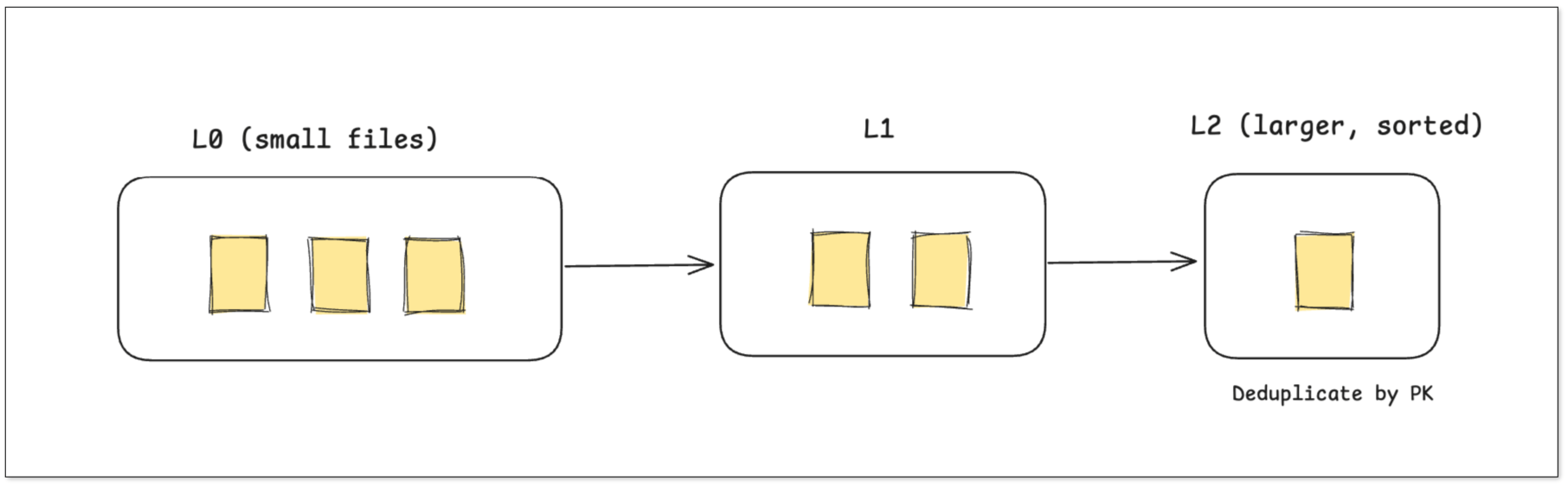 - 后台的 Compaction 任务 会在稍后自动将这两 个 L0 文件合并,在合并过程中根据主键保留最新版本的数据,生成一个更大的 L1 文件。