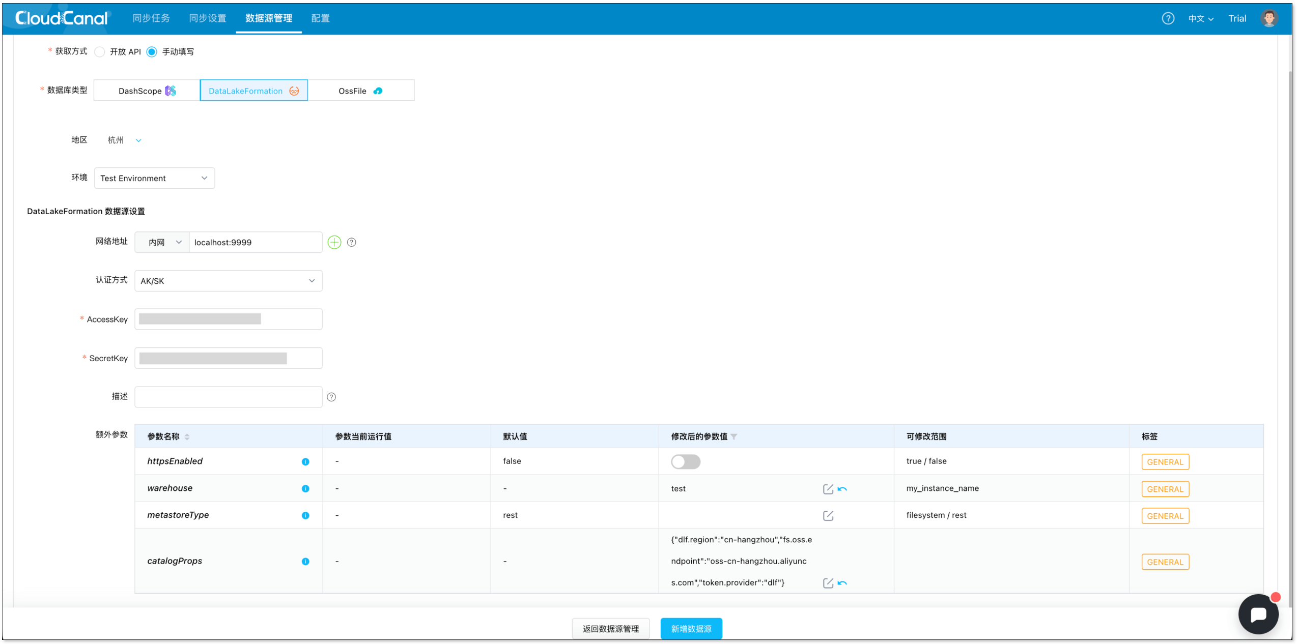 - 登录 CloudCanal 平台,点击 数据源管理 > 添加数据源,分别添加 MySQL 和 阿里云 DLF 数据源。