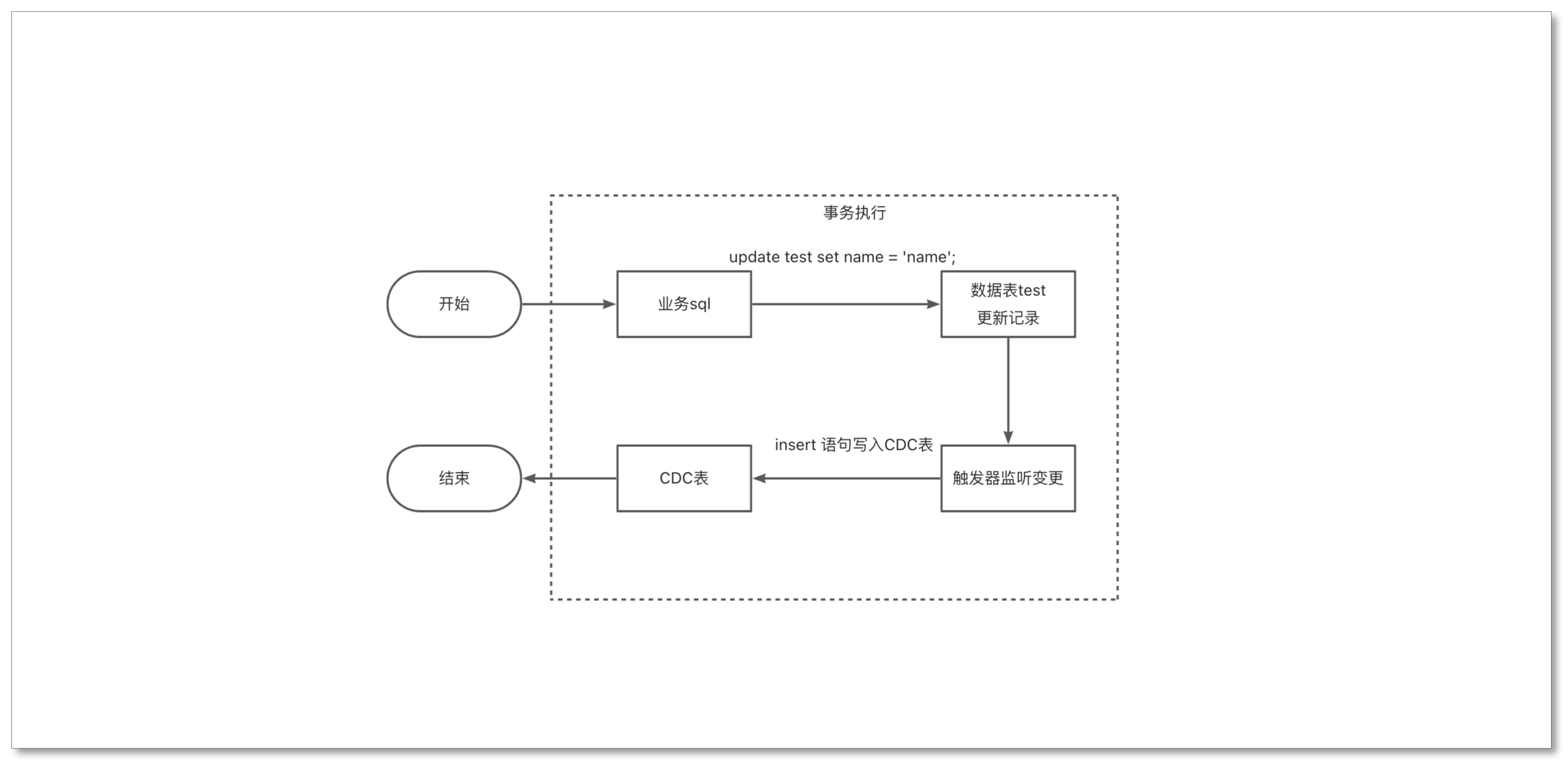 通过触发器实现增量数据同步,需要触发器捕获数据的I/U/D变更事件并写入增量 CDC 数据表,数据的变更事件最终都会写到增量 CDC 数据表,执行流程如下: