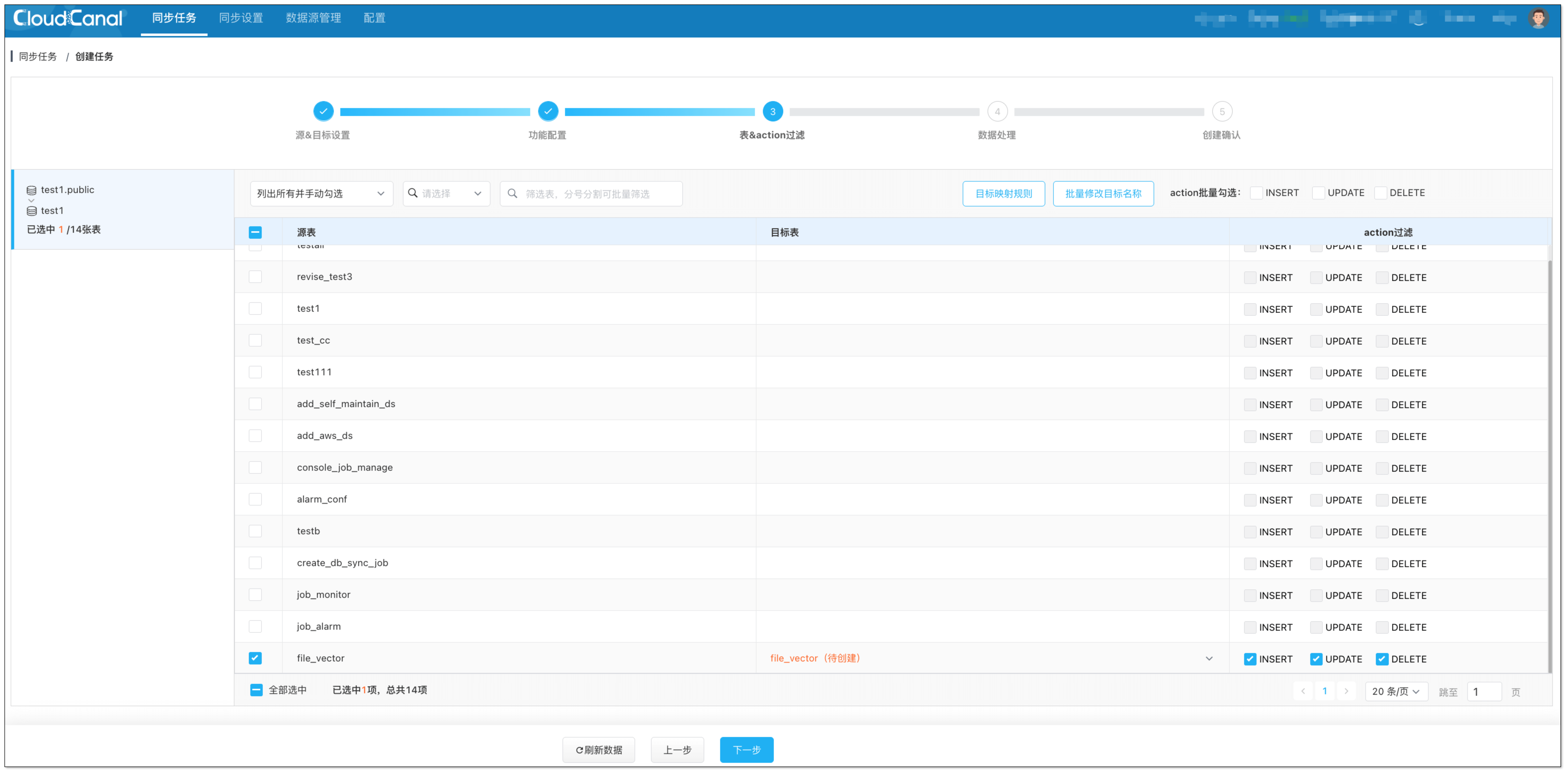 - 在 表&action过滤 页面,选择要使用的向量表(可多选)。