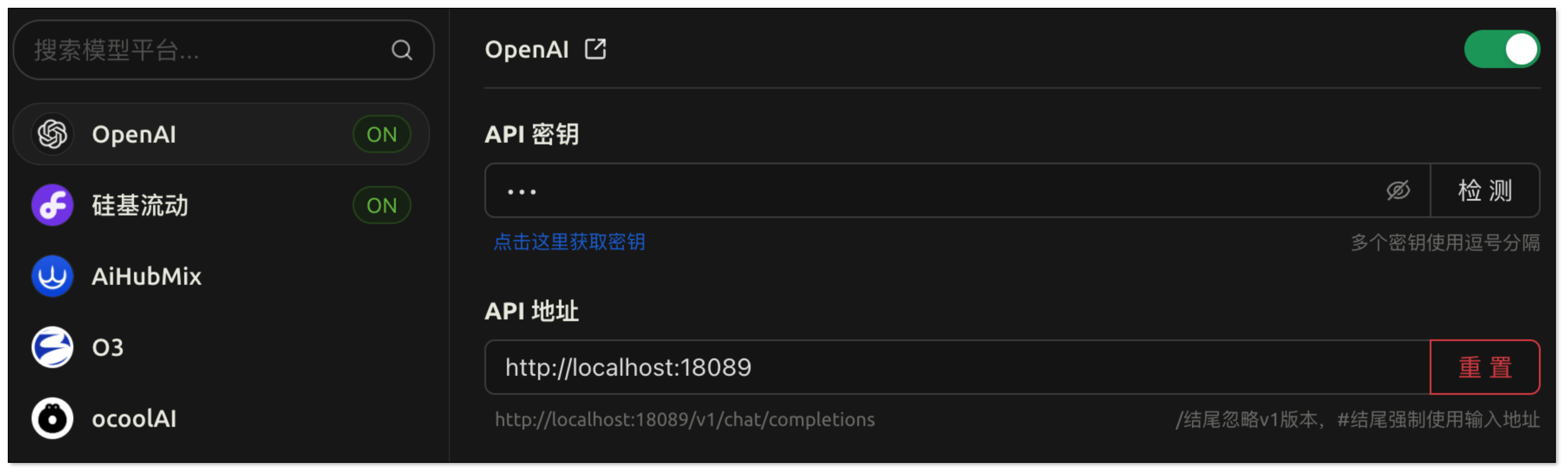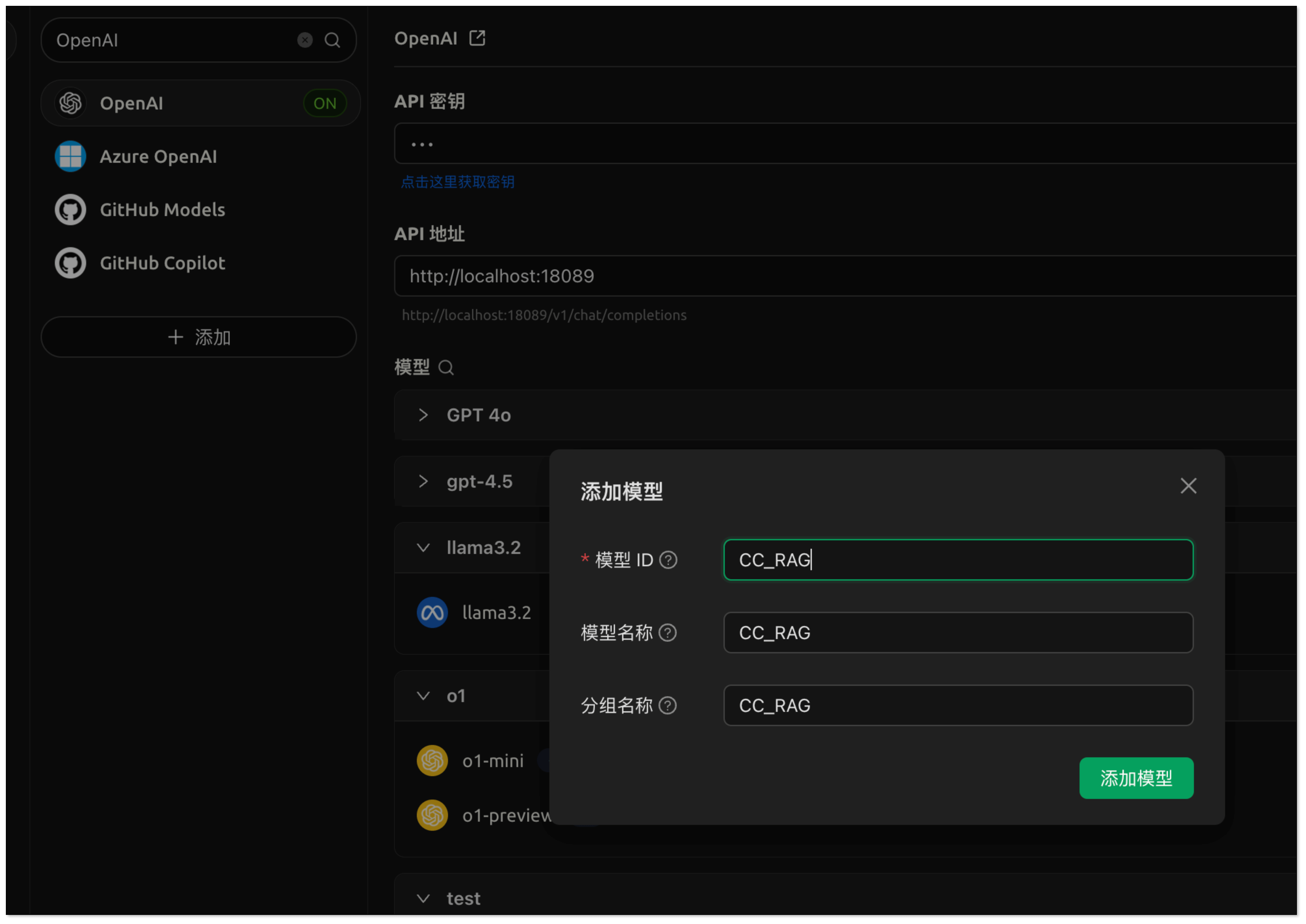 除了命令行方式,RagApi 也支持通过可视化工具 CherryStudio 进行交互测试。CherryStudio 兼容 OpenAI 接口标准,适合用于接口联调、上下文调试和模型效果验证。