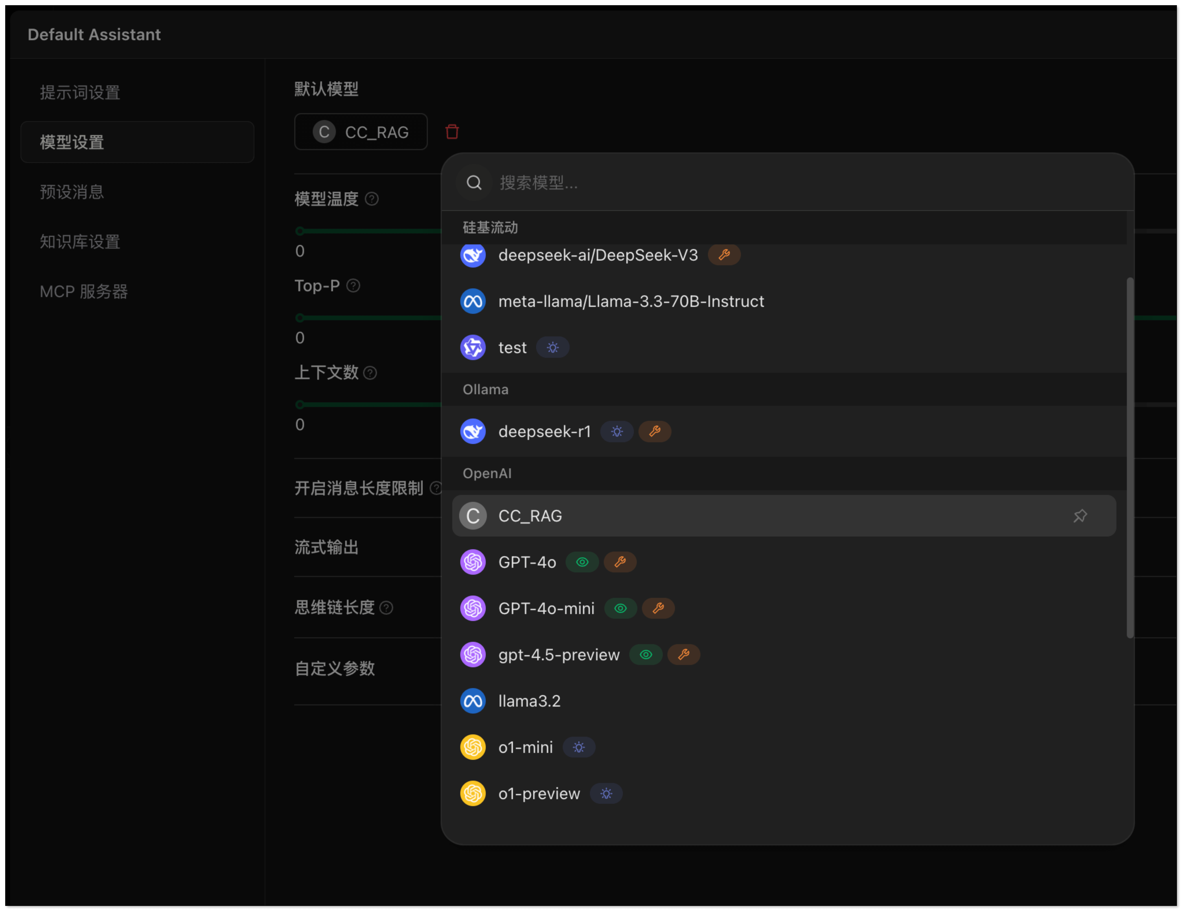 - 右键点击 Default Assistant → 编辑助手 → 模型设置,绑定上一步添加的模型。