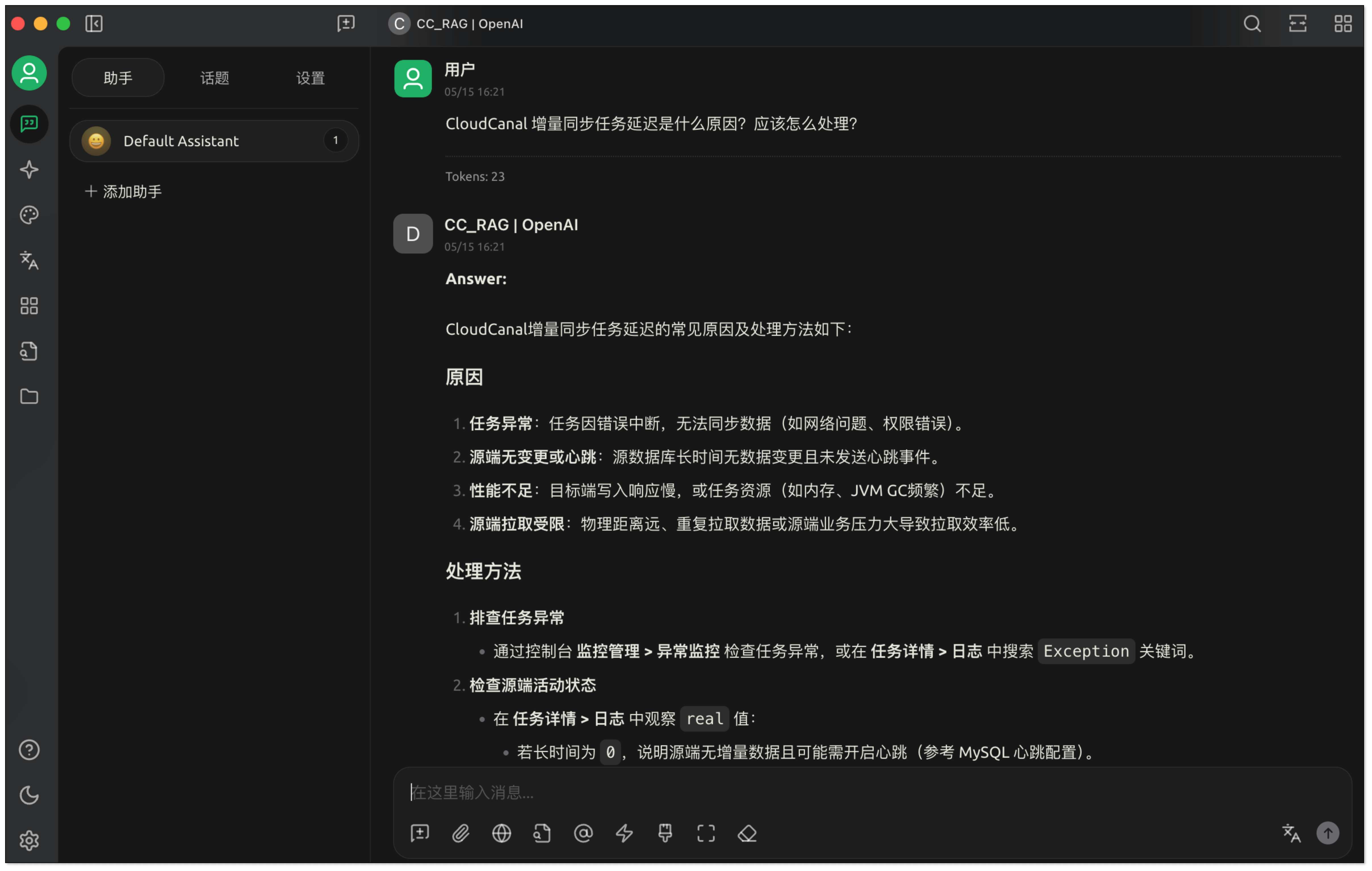 4. 返回对话窗口,输入:CloudCanal 增量同步任务延迟是什么原因?应该怎么处理?,RagApi 将根据向量数据检索相关内容,并通过对话模型生成响应。