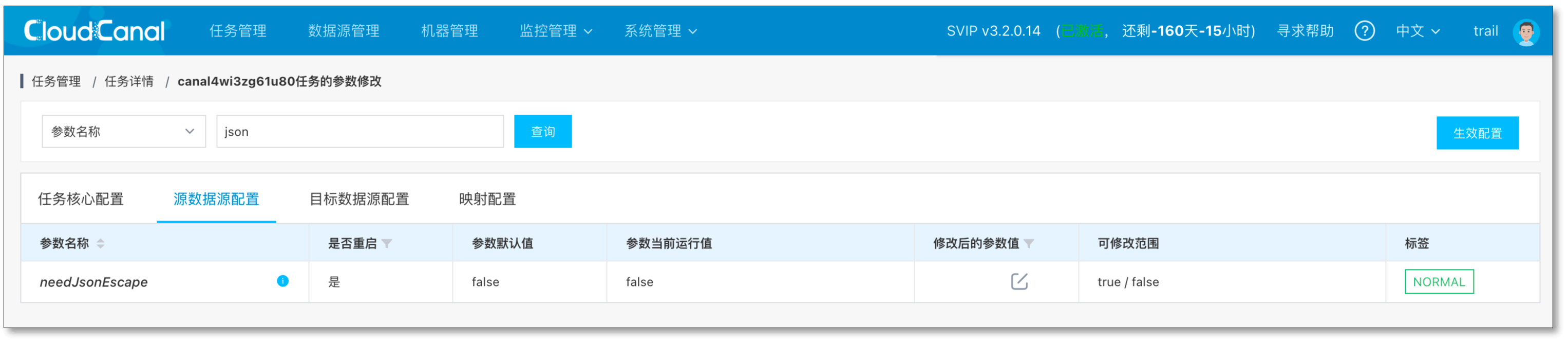 - 任务详情 > 更多功能 > 参数修改 > 源数据源配置,设置参数 needJsonEscape 为 true